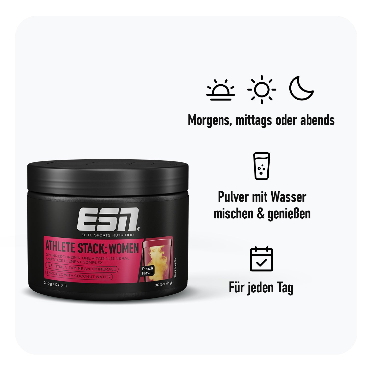 1 drink, complete support – mit unserem Athlete Stack: Women Powder. Dieser Drink versorgt dich mit einem All-in-One-Komplex aus Mikronährstoffen – optimal dosiert für den erhöhten Bedarf von Athletinnen. Erfrischend, einfach, effektiv.