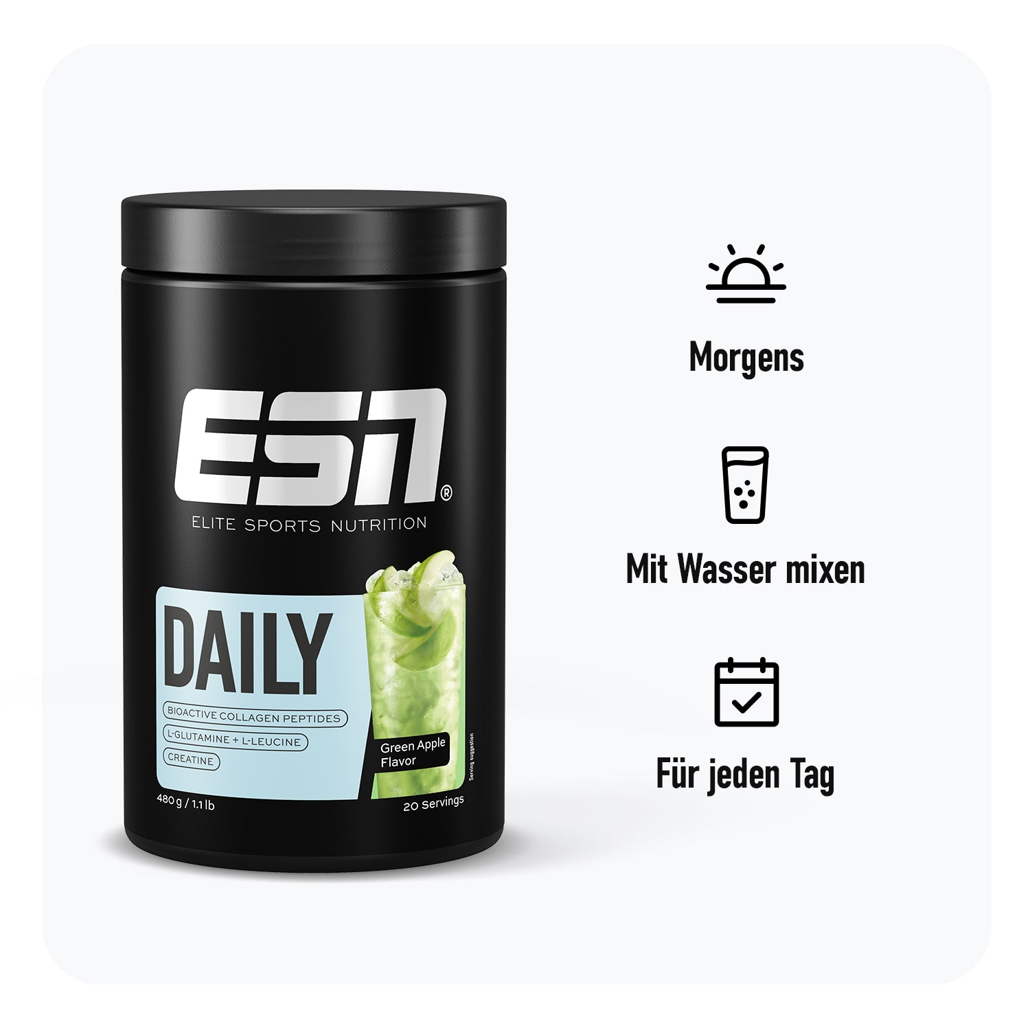 Everyday for the win – mit unserem Daily. Mit der Kombi aus Kollagenpeptiden, L-Glutamin, Creatin¹ und L-Leucin unterstützt dich unser Daily Drink jeden Tag bei der Versorgung deiner Gelenke, Sehnen, Bänder und Knorpel - also deine Basis für maximale Performance.
