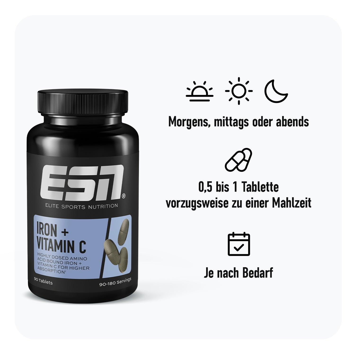 Your power boost: Iron + Vitamin C. Die Kombi aus Eisen und Vitamin C versorgt dich mit ordentlich Power, wirkt Müdigkeit entgegen, unterstützt dein Immunsystem und mehr.¹'²'³ Ideal, um im Training und auch im Alltag optimal zu performen. Let‘s go!