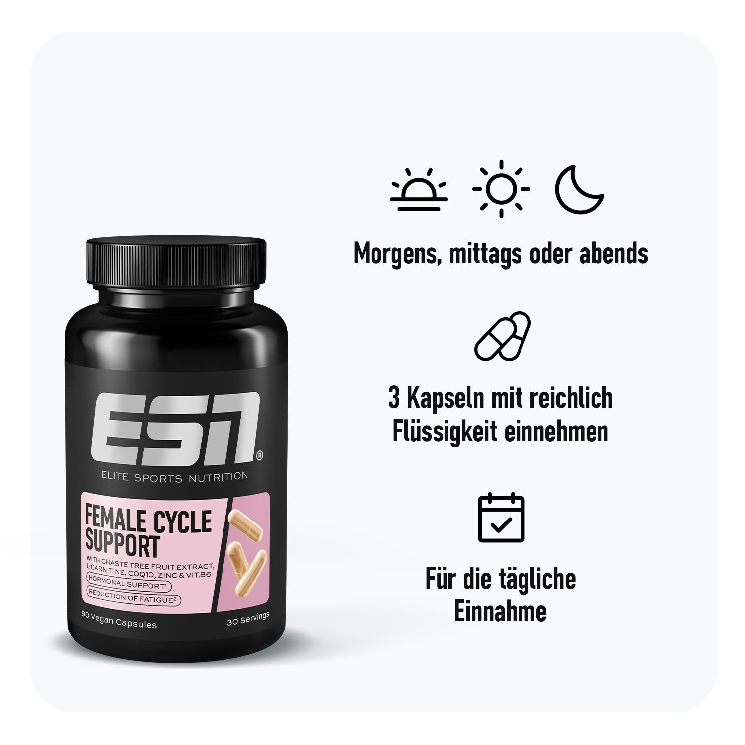 Und hier kommen unsere Hormon-Balance-Kapseln Female Cycle Support ins Spiel. Entwickelt für Frauen, die hohen körperlichen und mentalen Belastungen ausgesetzt sind, bietet es gezielte Unterstützung für ein hormonelles Gleichgewicht. Mit einer einzigartigen Kombination aus Mönchspfeffer-Extrakt, Vitamin B6, einem wissenschaftlich fundierten Aminosäuren-Komplex und mehr kann es dazu beitragen, das Wohlbefinden zu unterstützen, Müdigkeit zu reduzieren und den Hormonhaushalt in Balance zu halten.1,2,3 Dank dieser Formel kannst du dich auf das Wesentliche konzentrieren – deine Performance, deine Ziele und dein Wohlbefinden. Mit unserem Female Cycle Support bleibst du in Balance, auch wenn das Leben hektisch wird.1,2,3