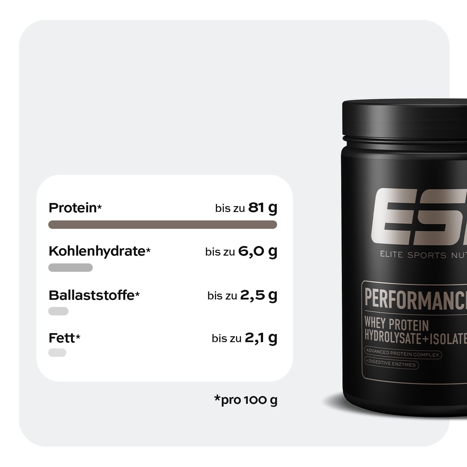 Unser Performance-Whey mit schnell verfügbarem Protein sowie Verdauungsenzymen