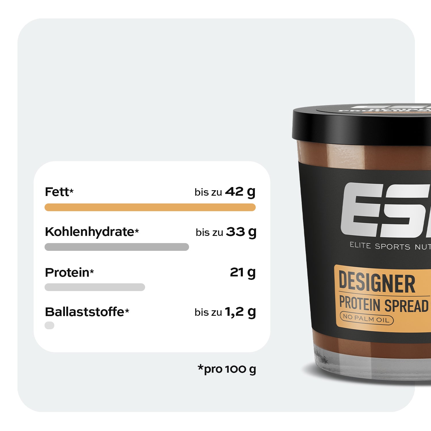 Rapsöl, Molkeneiweiß (Milch) 25 %, Süßungsmittel (Maltit), Kokosnussflocken 8 %, Kakaobutter, Süßmolkenpulver (Milch) 6 %, Emulgator (Lecithine), natürliches Vanillearoma. Herkunft Zutaten: EU/ Nicht-EUDesigner Protein Spread Key-Facts