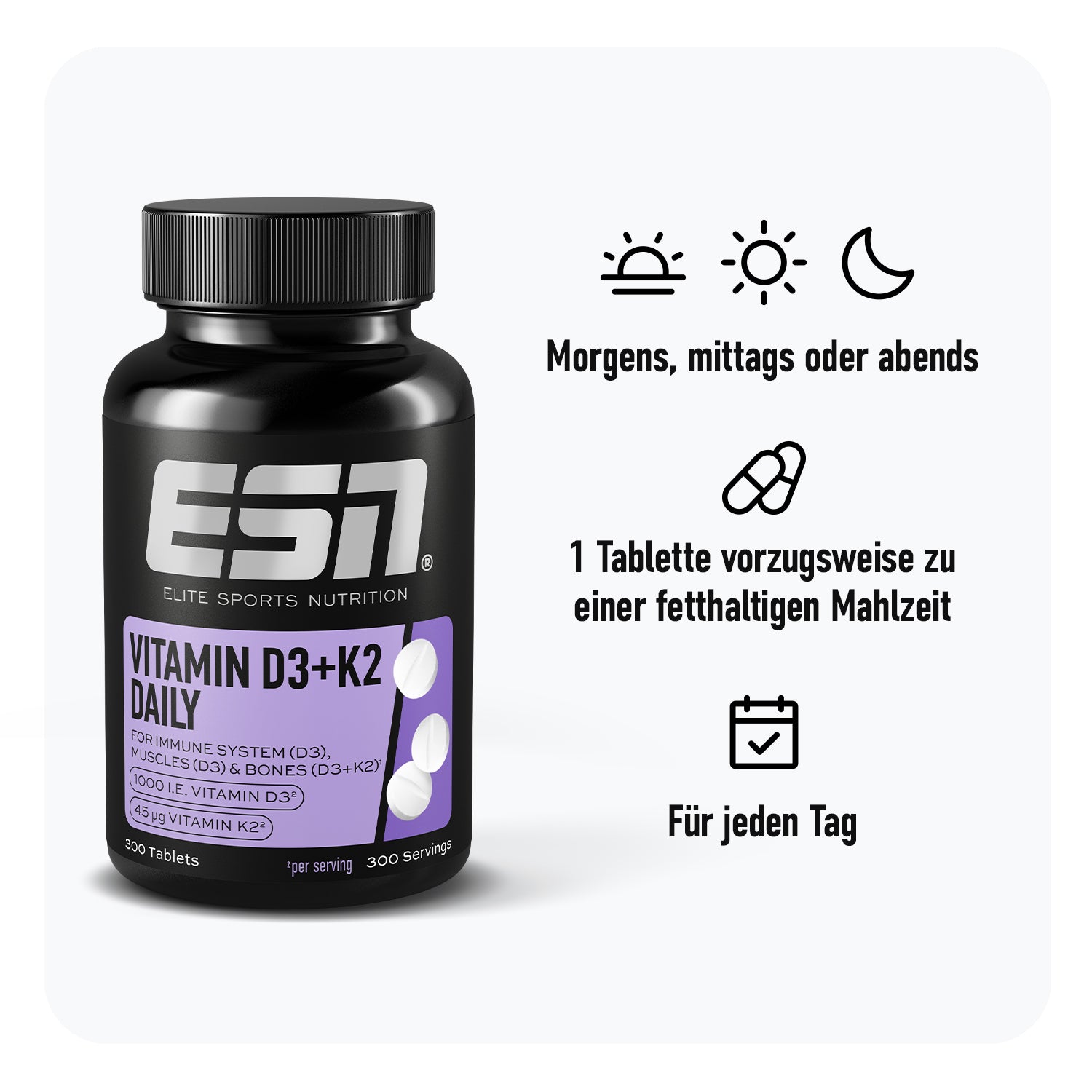 2 vitamins, 1 mission: Vitamin D3+K2 Daily. Vitamin D3 unterstützt dein Immunsystem, deine Muskeln, zusätzlich unterstützen Vitamin D3 und Vitamin K2 deine Knochen – alles, was du für deinen Alltag und dein Training brauchst.1 Dank der praktischen Einzeltabletten kannst du deine Zufuhr flexibel und individuell anpassen.